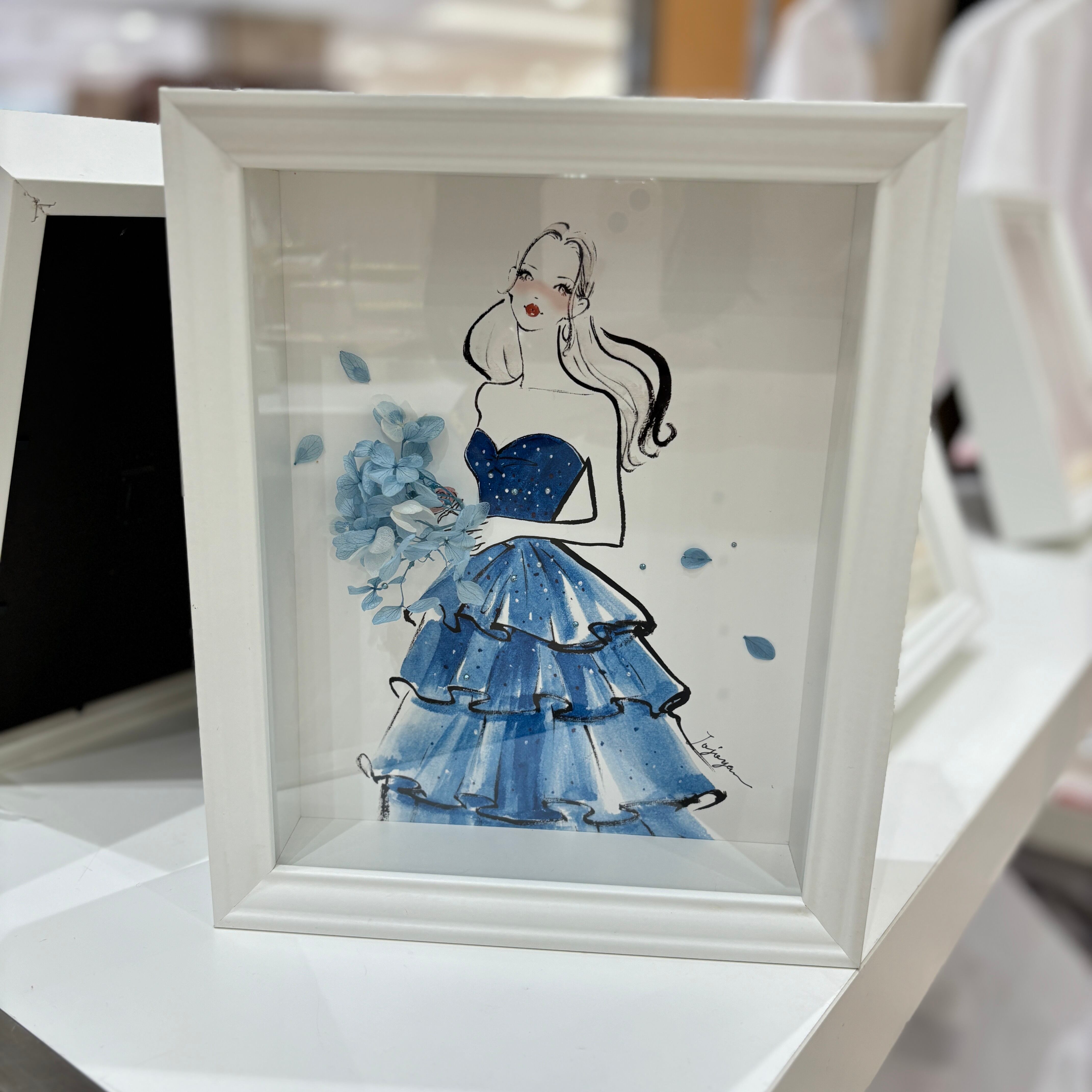 繊細なドライフラワーで丁寧に仕立てられた、華やかなドレスの絵画作品です。