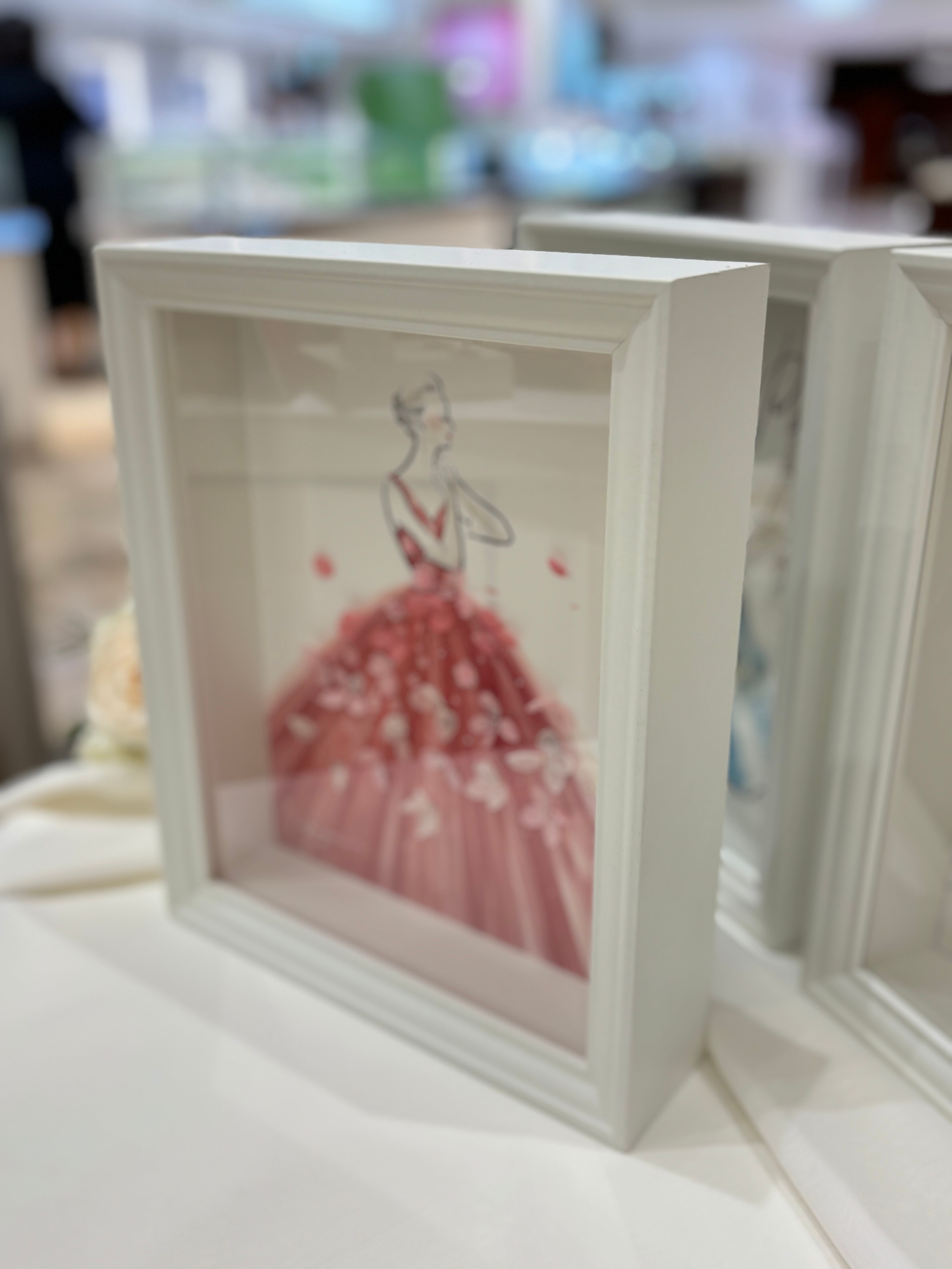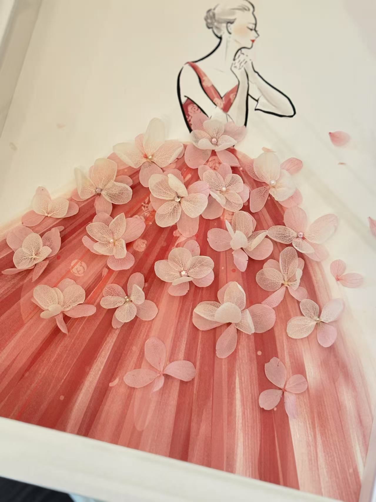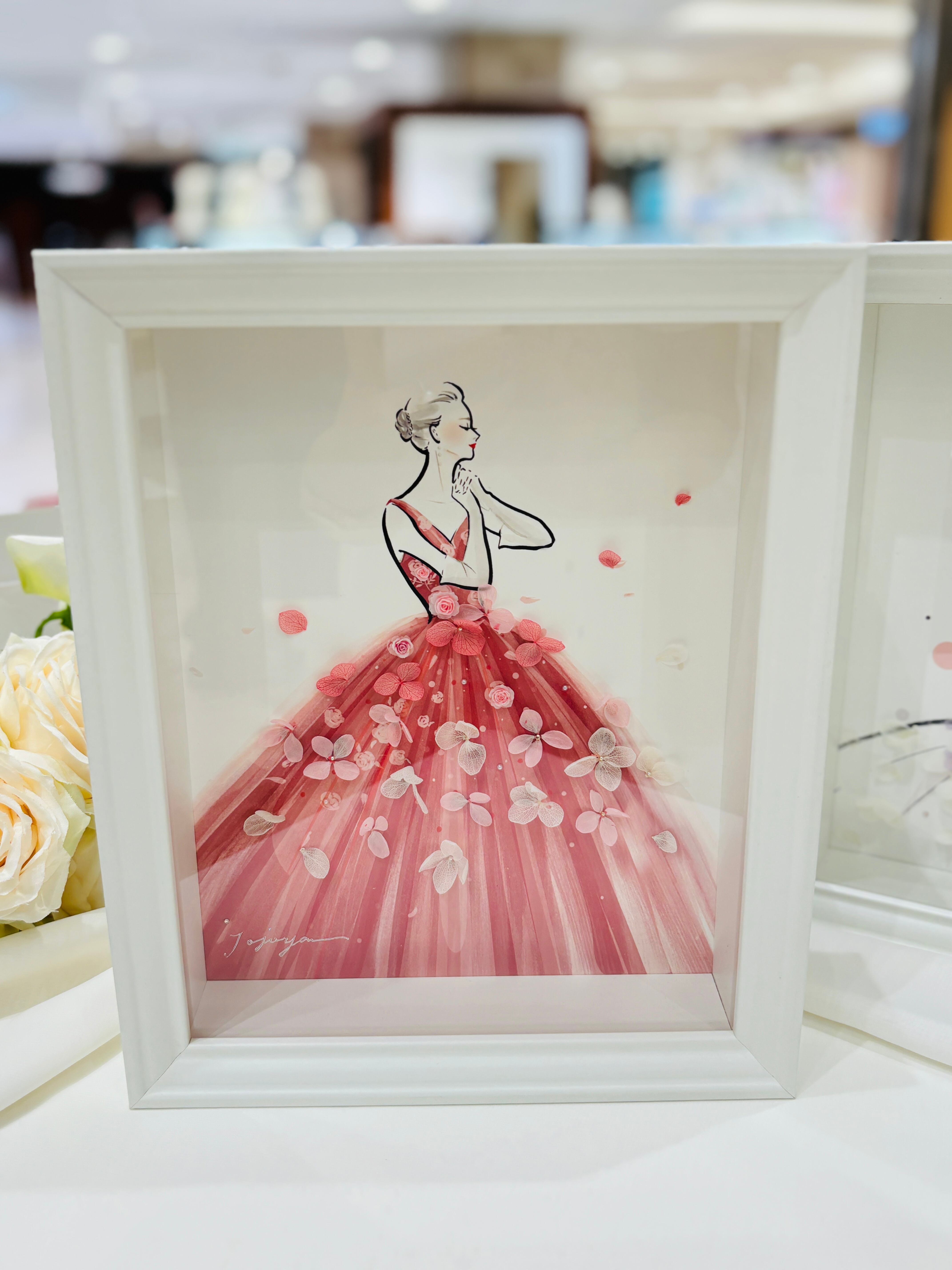 繊細なドライフラワーで丁寧に仕立てられた、華やかなドレスの絵画作品です。