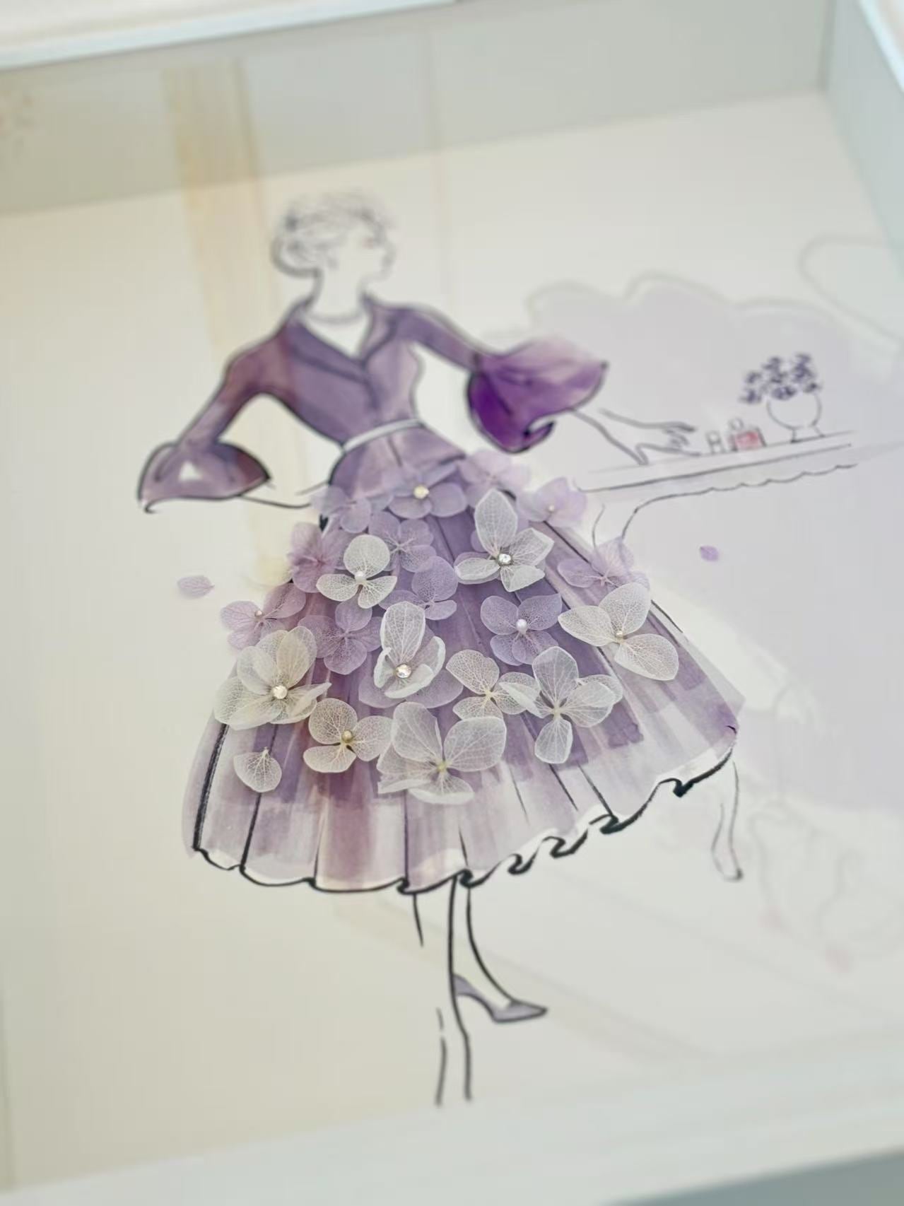 繊細なドライフラワーで丁寧に仕立てられた、華やかなドレスの絵画作品です。
