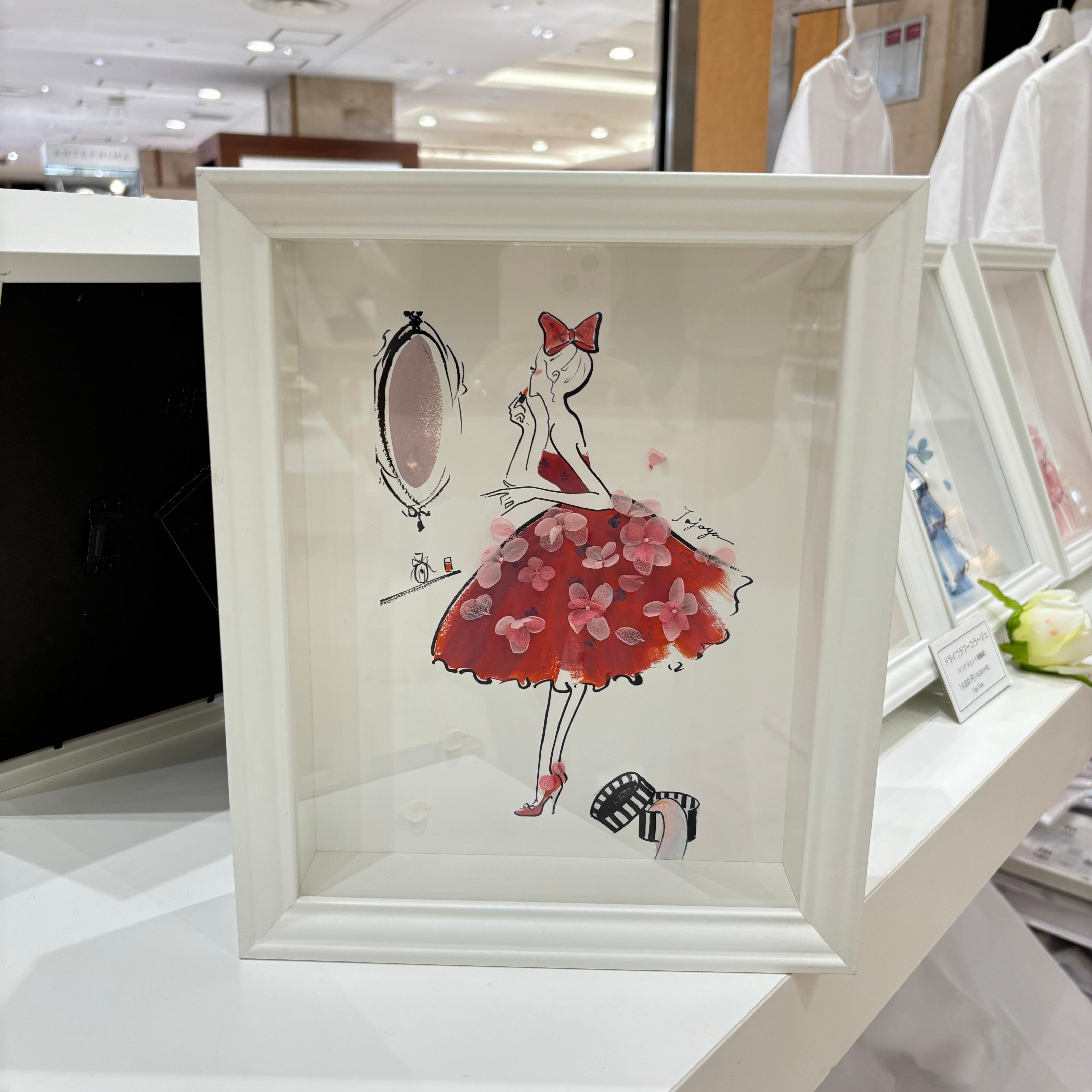 繊細なドライフラワーで丁寧に仕立てられた、華やかなドレスの絵画作品です。